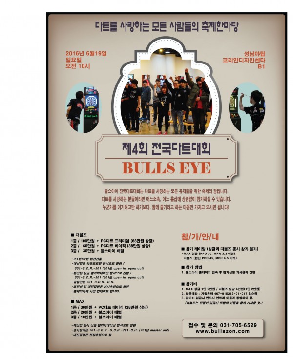제4회 불스아이 전국다트대회 페이지 정보 작성자 불스아이 작성일17-12-13 20:32 조회12,441회 댓글0건 관련링크 이전글 다음글 목록 본문 일시 : 2016년 6월 19일(일요일) 장소 : 성남 야탑 코리아디자인센타 B1 부문 : 싱글즈 / 더블즈 이전글 다음글 목록